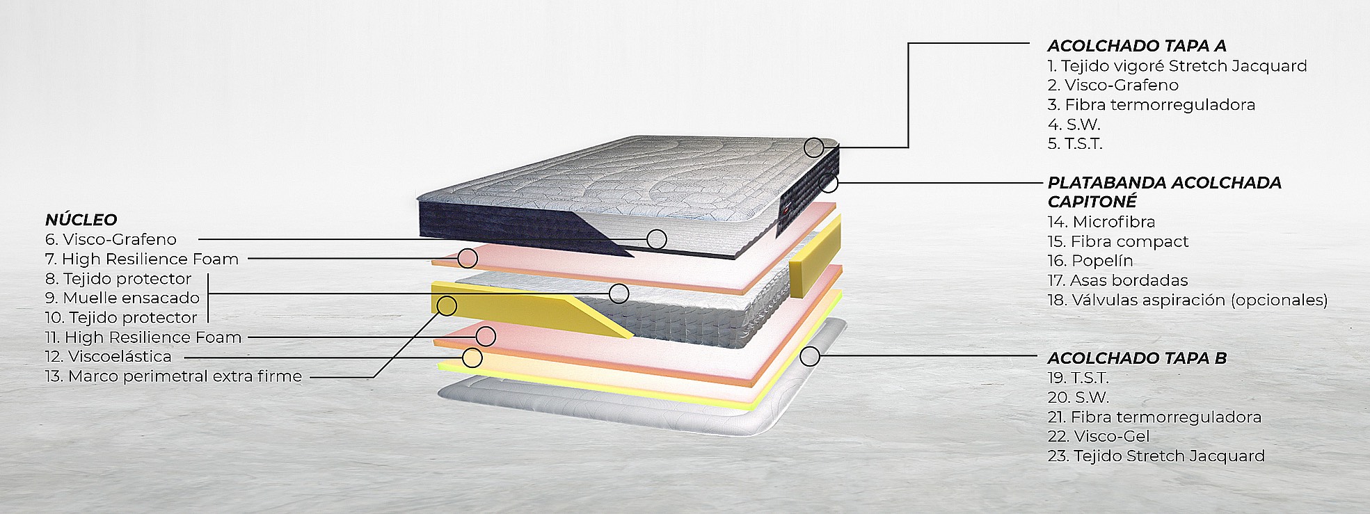 Reversible, con una cara de verano más fresca con Visco-Gel y otra cara con Visco-Grafeno que disipa la acumulación de calor, lo que la hace ideal para todo el año.